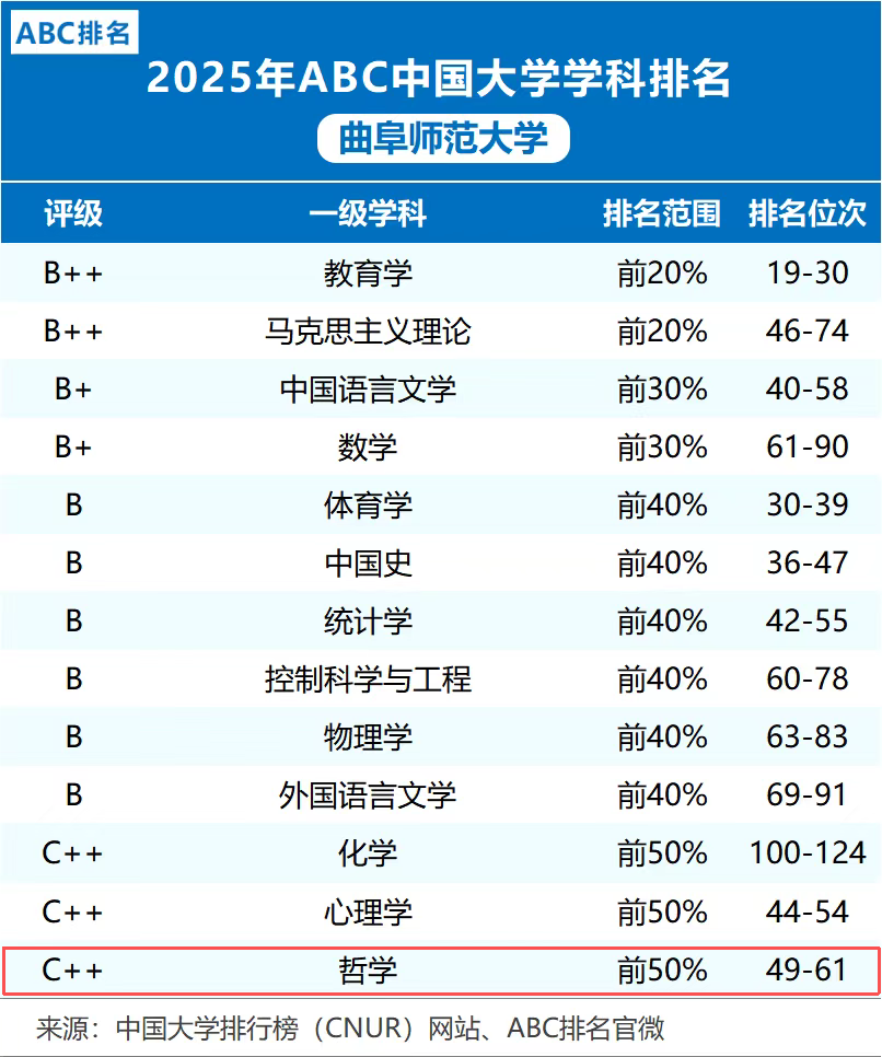 哲学学科在2025年ABC中国大学学科排名中处于C++等级、全国前50%,位列全国49-61位,是学院哲学学科实力与影响力持续提升的重要表现。
